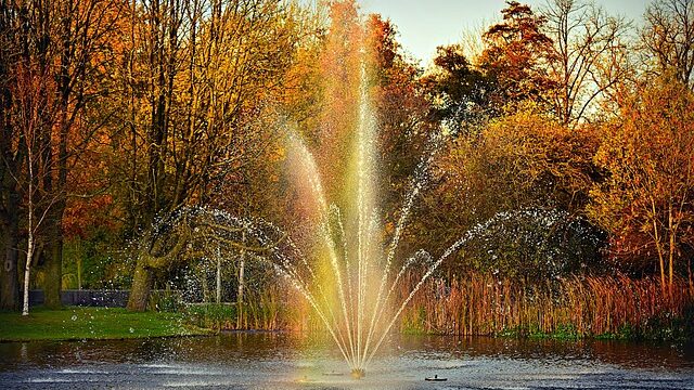 →店の外に大きな池と噴水があり、朝日に照らされて水しぶきがきらきら。音も耳に心地よいです。